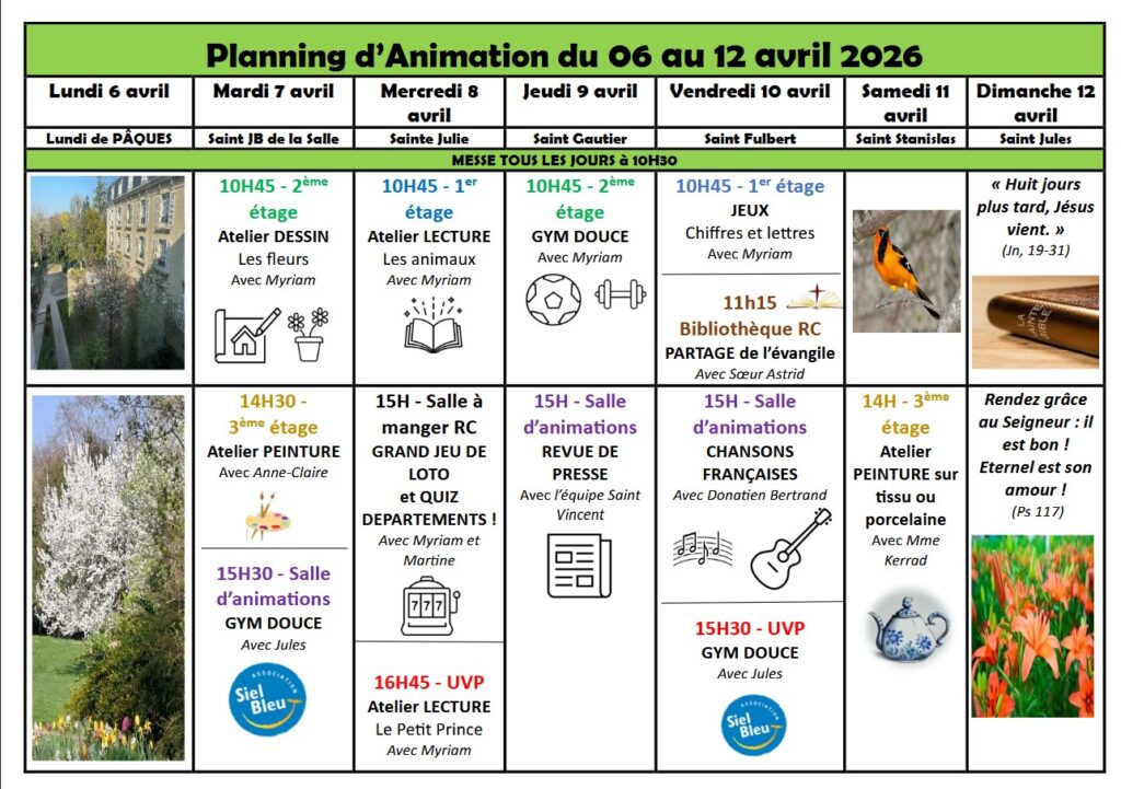 Planning des animations du 06 au 12 avril 2026 3 avril 2026. Actualités Planning Animation 6 au 12 avril 2026 Attachments Planning Animation 6 au 12 avril 2026 (886 kB) Next Prev